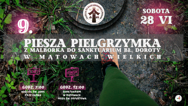 Zapraszamy na 9. Malborską Pieszą Pielgrzymkę z Malborka do Sanktuarium bł. Doroty w Mątowach Wielkich. Wyjście o godz. 7:00 rano z kościoła św. Jana przy zamku Trasa: Kościół św. Jana - Grobelno - Kraśniewo - Miłoradz - Mątowy Wlk. (Ok. 16 km) W Mątowach Uroczysta Msza Święta Odpustowa o godz. 12:00. Potem posiłek przy kościele. Powrót …