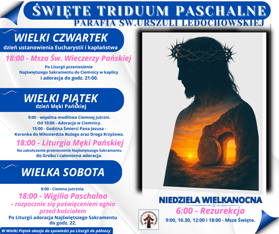 WIELKI CZWARTEK To dzień ustanowienia Eucharystii i kapłaństwa. Liturgia rozpocznie się o godz. 18. Będzie zawierała m.in. obrzęd obmycia nóg Apostołom oraz obrzęd poświęcenia książeczek na nabożeństwa dzieciom przygotowującym się do I Komunii św. Po Liturgii przeniesienie Najświętszego Sakramentu do Ciemnicy w kaplicy i adoracja do godz. 21. WIELKI PIĄTEK To dzień Męki Pańskiej. Rano …